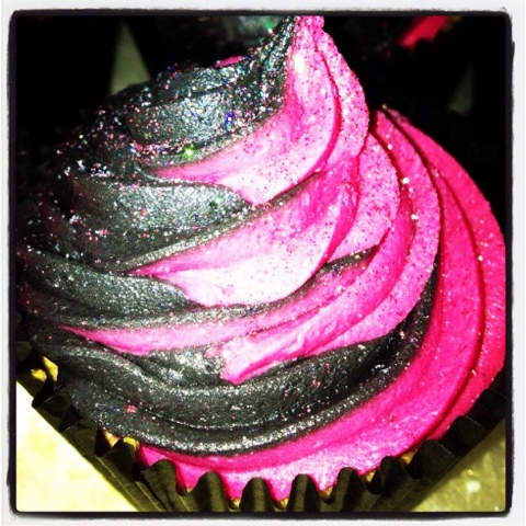 Vanilla cupcakes with pink and black two-toned butter icing and glitter.